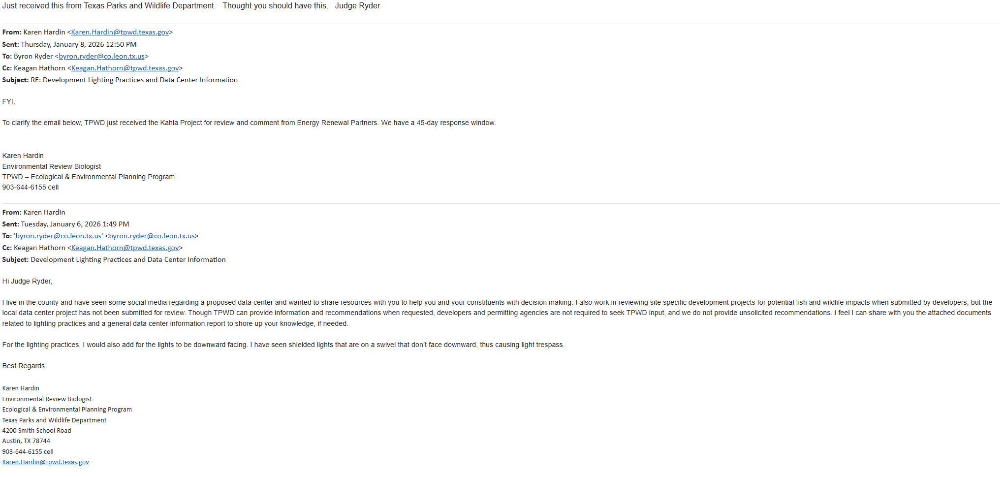 The Texas Parks and Wildlife Department (TPWD) has formally notified the Leon County Judge that it has just received the Kahla Project for review and comment from Energy Renewal Partners.